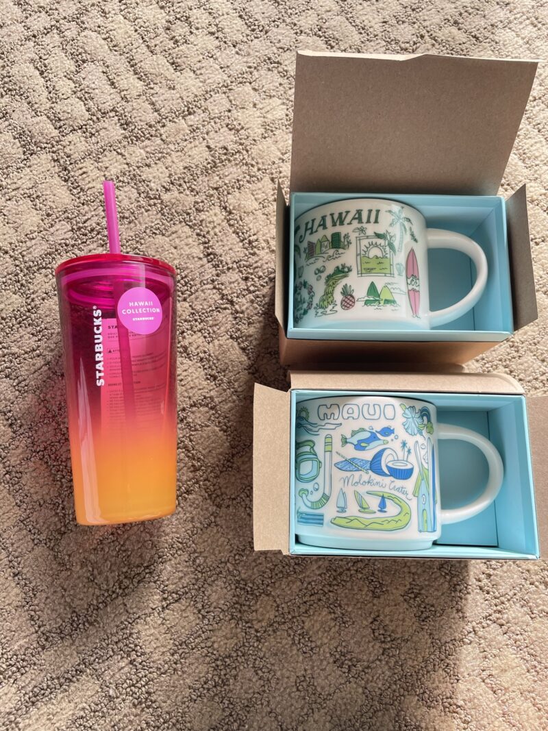 この写真以外にも、パイナップル型のタンブラーや、日本では公式に販売されていないハワイコレクションがたくさん、いく時期にもよっていろんなデザインを楽しめると思います。